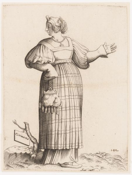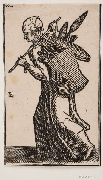 Curator: What strikes you first about Anthonie van den Bos’ “Standing Musician with Hand Puppet and Lute,” crafted sometime between 1778 and 1838 with pen and ink? Editor: It’s the linear precision. Look how economically the artist conveys texture and form with simple, unshaded strokes. The composition draws my attention directly to the lute's circular shape against the musician's draped clothing. Curator: Indeed. Van den Bos created this drawing during a time of political and social upheaval. The portrayal of musicians, often marginalized figures, speaks to broader issues of representation and class within Dutch society. The hand puppet, whispering into the musician's ear, could symbolize the hidden voices of dissent, particularly when looking at intersectional dialogues concerning power and societal reform. Editor: Perhaps, but observe how that circularity repeats. It echoes in the puppet's rounded head and again in the musician's own face. It seems the artist's main consideration lies in pattern, not necessarily any social statement. Look how skillfully the vertical lines of the garments contrast with the circles. It's a visual game of repetition and contrast. Curator: The technique definitely plays a part. But consider, this drawing is from the Baroque period—a time of dramatic artistic expression. Genre paintings, which is another way we classify this drawing, often reflected daily life and societal mores. Are we really so far removed to see the symbolism embedded within? Think about the socio-political commentary that musicians would use through the craft. It provides insights into a culture negotiating its own identity, right? Editor: Possibly. But in terms of pure aesthetic value, I am more attuned to the drawing's composition as an exploration of form and balance. To see the drawing as just being related to political commentary denies the careful artistry within the visual choices. The semiotic relationship of each formal choice cannot be overstated. Curator: Ultimately, maybe it is both: careful visual and aesthetic choices imbued with social commentary of the period. Editor: Yes, maybe appreciating both allows us to draw our own conclusions about the work's power and message.