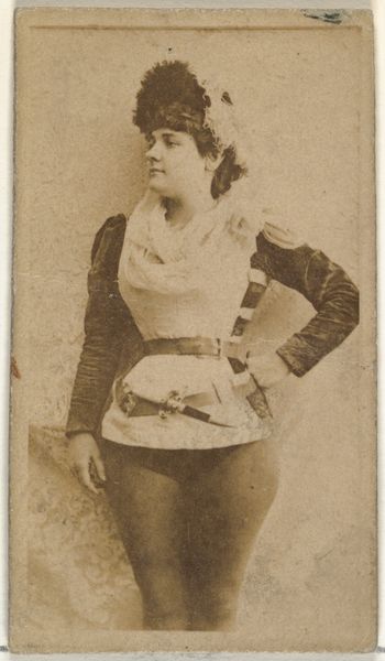 Curator: Here we have Card 729 from the Actors and Actresses series, produced by Allen & Ginter for Virginia Brights Cigarettes, likely between 1885 and 1891. It’s a small print, residing in the Metropolitan Museum of Art’s collection. Editor: Wow, there’s a definite cheekiness to this piece. Is that, like, early burlesque meets baseball card? The sepia tone gives it a dreamlike quality, but that pose… she knows what she's doing. Curator: Indeed. These cards were essentially promotional items. Allen & Ginter aimed to associate their brand with the allure of the stage and popular culture. The actresses, often in costume, became collectible icons. It’s about commercialism as spectacle, really. Editor: So, trading cards weren't always about athletes? It's wild to think of collecting images of performers like baseball stats. Though, the way she's working the camera – that’s definitely a skill! What do you make of that almost defiant gaze? Curator: It’s a calculated confidence, I think. This wasn't about naturalistic depiction; it's about constructing a persona, marketing celebrity through reproducible images. The Virginia Brights brand aimed for aspirations of modernity and social mobility and aligned it with attractive and popular actresses. Editor: Persona is right. Look at the costuming – is it attempting historical accuracy? It feels playfully ahistorical! Almost like a very specific fashion mood board, for Virginia Brights customers… "Buy these, and *become* her!” I guess advertising hasn't changed as much as we think. Curator: Precisely. The cards offered consumers access, albeit mediated, to the glittering world of the stage. This commodification and distribution of fame are a crucial aspect of understanding visual culture at the time. The mass production and trade surrounding objects like these created shared touchstones within popular imagination. Editor: Right, right...so beyond the branding element. What do you suppose this card did for the portrayed actress herself? Was this mere exposure, or did she garner tangible influence as a result? Curator: In many ways it further enshrined their status, creating lasting public presences—legacies really—tied to the company and the plays in which they performed. Although the actresses probably weren’t compensated directly by the Cigarette companies, the branding and notoriety certainly elevated their standing and likability amongst their target audiences. Editor: This has totally tweaked my thinking about ephemera, like cigarette cards, you know? Curator: Mine too, actually! The ability for the everyday items of this period to create enduring cultural footprints has caused a lasting impact on not just marketing trends but a whole visual language for social and individual representation!