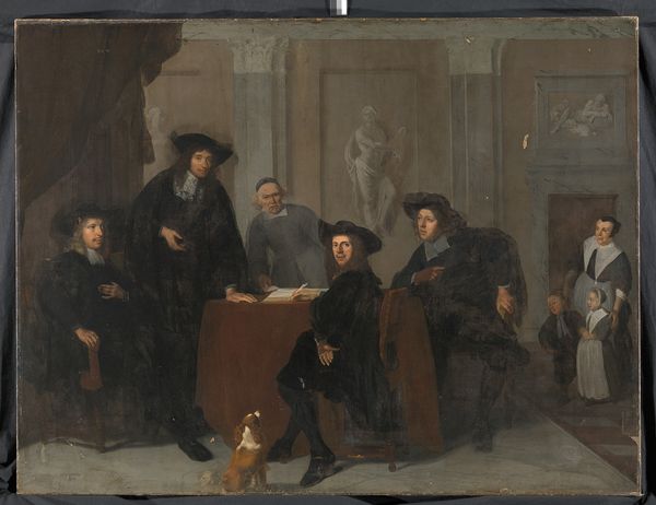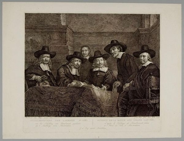 Editor: Right, next up, we have Felix Ziem's "Les syndics des drapiers, copie d’après Rembrandt", painted in 1853. It's an oil painting. Honestly, it looks quite… foreboding? All those dark colours and serious faces. What’s your take on it? Curator: Foreboding, yes, but perhaps also a little mischievous! Ziem copying Rembrandt… it’s like a painter’s wink across time. Imagine him, standing before the original, brush in hand, feeling the weight of Rembrandt’s genius. But he’s not just copying; he’s interpreting, he’s adding his own flavour. It’s a 19th-century artist playfully nodding to the Baroque. Can you feel that dialogue? Editor: I see what you mean. The way he's captured the light feels quite modern. Almost theatrical. Curator: Exactly! Notice how the light falls – those intense glares of illumination amid a murky stage? That is theatrical drama. He almost lets it drip from the brush with all that expressive freedom in his strokes. What is interesting is to consider what Ziem is trying to do here with this…conversation between copies? Editor: So, it's not just about replicating Rembrandt’s work, but about engaging with it, responding to it? Curator: Precisely. Consider that these paintings might have once stirred political and commercial debate. Now, it sparks dialogue of artistic sorts - like the conversation between our thoughts now! Think about Ziem wrestling with the legacy of an artistic hero; you are here interpreting him. We’re all just riffing off each other! Editor: It’s a copy, but also a completely new creation. That’s… unexpectedly freeing! Curator: Art is a dance with ghosts, don't you think?