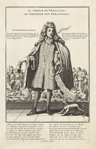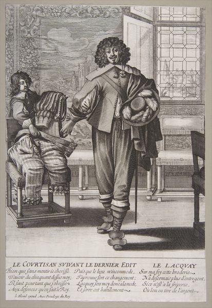 Editor: So, this is Abraham Bosse's "A Courtier Following the Recent Edict," made sometime between 1630 and 1676. It’s an engraving, all delicate lines and shading, depicting a rather flamboyant gentleman discarding his elaborate clothes. It feels satirical somehow. What's your take? Curator: Oh, absolutely satirical! Bosse, with that razor-sharp wit, dissects societal vanities here. The "recent edict" probably refers to sumptuary laws attempting to curb excessive spending on attire. The poor fellow seems resigned, doesn't he? Look at his expression, that theatrical gesture! Editor: It’s like he’s simultaneously mourning the loss of his finery and performing for an audience. Is it just me, or is there something inherently performative about fashion? Curator: Indeed! Clothing is a language, isn’t it? In Bosse’s time, particularly, attire broadcasted status, wealth, allegiance...and sometimes, defiance. This print captures the tension between individual expression and social constraints. Is he a victim or complicit? Editor: That’s the genius, isn't it? It's not a simple condemnation, but a nuanced observation. Almost melancholic, the way he dramatically waves towards that ridiculously ornate pile of clothes like they’re old friends… Curator: And those ribbons practically weeping from his shoes! It all speaks volumes, doesn't it? Perhaps a gentle reminder that, beneath the surface, we’re all playing a role, costumed in societal expectations. I love it! What's been most fascinating about Bosse for you? Editor: Definitely this delicate dance between genuine feeling and outward performance! Curator: For me, it’s how a few etched lines can convey such depth, a miniature play unfolding on paper! A truly insightful artist, indeed!