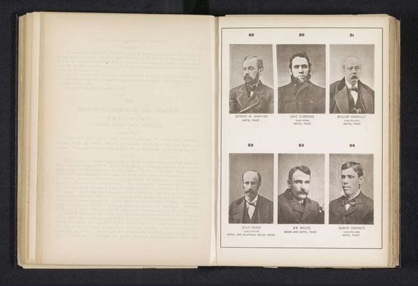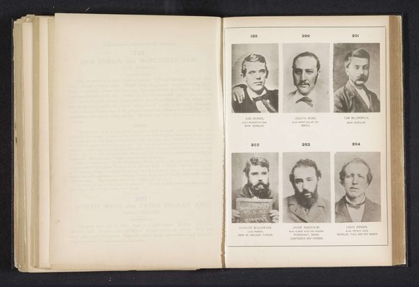 Editor: Here we have, from before 1886, “Zes portretten van dieven (bank sneaks)” or, “Six Portraits of Thieves (Bank Sneaks)". It looks like a printed photograph. There’s something chilling about seeing these men, their portraits lined up so neatly. Almost like a rogue's gallery. What’s your take? Curator: Indeed, there’s a sense of societal taxonomy in play here. These faces, captured with such stark clarity, force us to confront the uncomfortable reality of criminality woven into the fabric of society. I wonder, did the photographer see them as simply subjects, or as embodiments of a certain moral failing? Does the format itself -- the regimented grid of portraits -- dehumanize them further, reducing them to specimens under glass? It's fascinating to ponder the interplay of social judgement and photographic objectivity. Editor: It makes me think about surveillance today, about mugshots that are everywhere, instantly accessible. Does that change the way we see this historical work, knowing how much the technology and context has evolved? Curator: Absolutely! This piece serves as a potent reminder of photography's evolving role in shaping perceptions. It’s like peering through a looking glass, glimpsing not only the past but also the reflection of our present anxieties around crime, visibility, and the very nature of justice. Who are we to judge? Editor: That makes me see it differently. It’s less a historical record and more a mirror reflecting our ongoing social concerns. Curator: Precisely. Art is a conversation, a dialogue across time, continually reshaped by the observer. What we bring to it, shapes what we find. Editor: Well, that certainly gives me a lot to think about! Thanks for your insights.