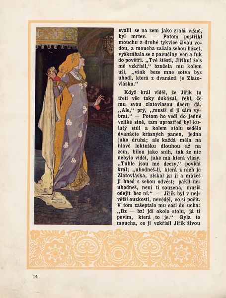 Ivan Bilibin created this illustration for the Russian fairy tale "Vasilisa the Beautiful" using watercolor, gouache, ink, and gold paint. His work taps into deeper social and cultural themes present in early 20th century Russia. Bilibin created a visual language rooted in Russian folk art, using intricate patterns, vibrant colors, and stylized figures. The image depicts a scene of social hierarchy, with the Tsar and his court positioned prominently, while an old woman bows before them. The old woman has come to sell the Tsar a beautiful cloth made by Vasilisa. This tale emphasizes the value of women's labor, their skill with textiles being of particular value. Bilibin's illustrations brought these stories to a wider audience, reinforcing their cultural significance. By studying Bilibin's illustrations in the context of the fairy tales they accompany and through the lens of Russia's socio-political landscape, we can further understand the role of folk art in shaping national identity.