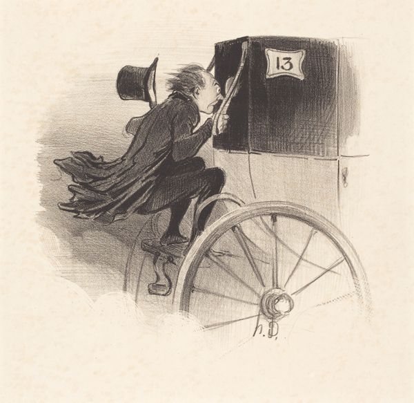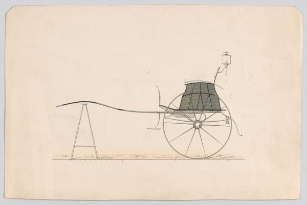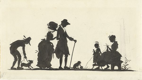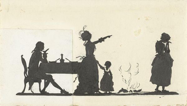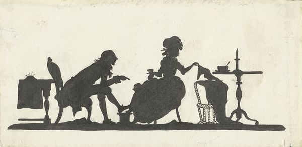 Curator: Welcome. We're standing before Nelly Bodenheim's silhouette drawing, "Ontwerp voor In Holland staat een Huis: silhouet van een man die uit een koets een huis binnengaat," dating from between 1884 and 1917. It’s executed in ink on paper. Editor: My first impression is one of constrained elegance. The severe monochrome contrasts against the meticulous detail, creating a compellingly formal image. Curator: Absolutely. The essence here is in the linear form—the economical lines conjure up not just the outlines, but volume, weight, and even the texture of clothing. Look at the wheel's precise geometry, balanced against the figure's slight forward lean. The tension derives from the implied motion created by line. Editor: The narrative implications interest me just as much. What sort of narrative context, and potentially ideological structures, allowed a man of obviously elevated social status to stride confidently forward from such elaborate transportation? The period is so relevant to discussing Dutch privilege. Curator: Bodenheim's choice to render the scene solely in silhouette further flattens the image and reduces it to essential forms, almost abstracting it. Semiotically, it’s stripped of any real depth, demanding closer attention to line and shape. The house’s implication goes unexamined beyond a couple of implied handrails. Editor: Perhaps it's meant to highlight exactly who had access to such dwellings, further driving home themes of socio-economic disparity. I wonder what class or race the inhabitants represent. Silhouettes always speak volumes by what they omit—literally, casting a shadow—to expose the stark social realities and their reproduction in early Dutch children’s books. Curator: And yet, without a complex color palette, Bodenheim encourages viewers to concentrate on compositional concerns—figure/ground relationships, texture made only with black ink. We come to discover so much regarding material presence, through pure line. Editor: Material realities cannot be detached from historical realities, though. Consider the artwork's relationship to print media culture, which both reinforced and sometimes subtly critiqued prevailing ideologies through illustration and form. These stark contrasts create striking conversations between structure and societal framework. Curator: Precisely. The pure simplicity, though, offers something profoundly sophisticated by making shape the sole communicator of meaning here. I am just endlessly taken with the artist’s command over the deceptively simple technique. Editor: Seeing how she works against convention helps us ask poignant questions about power—especially those represented and reinforced by the economic factors of everyday society and publishing. A very productive viewing experience, all told.