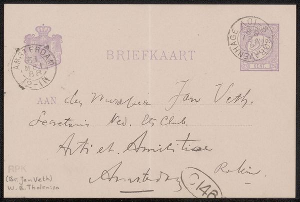 This is a pre-printed postcard designed by Willem Witsen in the Netherlands, likely in the 1890s, for correspondence within the artistic community. The very design of this card speaks to the institutionalization of art. Note the pre-printed word "Briefkaart" at the top, marking it as a standardized form of communication sanctioned by the postal service. The royal crest signifies state endorsement and the stamp indicates that the state sanctioned postal service delivered it. The card is addressed to fellow artist, Philip Zilcken, suggesting a network of artists who relied on institutional structures for communication and the circulation of ideas. The Rijksmuseum's acquisition of this object places it within a system of valuation and preservation. To understand this card fully, archival research into the correspondence of Witsen and Zilcken, as well as an examination of the postal history of the Netherlands, would be essential. This illuminates the conditions under which art is created, disseminated, and ultimately, preserved as a historical artifact.