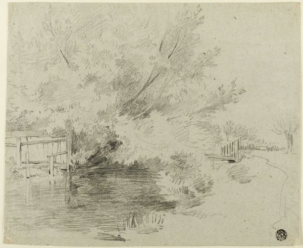 Curator: Jozef Israëls offers us this sketch, rendered in pencil and ink, depicting a ‘Beek met bruggetje tussen bomen’—a creek with a small bridge nestled among trees. He likely made it sometime between 1834 and 1911. It now resides here at the Rijksmuseum. Editor: The first thing that strikes me is its quiet intimacy. The strokes are delicate, almost hesitant, creating a hushed atmosphere, like stumbling upon a secret place. Curator: Absolutely. You can almost feel the cool dampness rising from the paper itself, can’t you? I see Israëls as such a chronicler of quiet lives and hidden emotional landscapes. Here, the bridge isn't just a physical structure but perhaps a metaphor for a crossing—a gentle invitation. Editor: Speaking of structures, the medium is everything. Pencil and ink drawings have this interesting position. Is it a quick sketch, a study, or a finished work? The labor feels evident. Did he toil over each detail, or let the materials lead him? Was this meant to be exhibited, or used as a pattern for something? It challenges the boundaries between art and design. Curator: Such excellent questions! Consider Israëls' artistic circle. This could very well have been for his own reflection or preparatory studies. He certainly uses line beautifully. See the delicate hatching that creates volume and texture in the leaves, so skillfully rendered, so subtle! The bridge's supports seem to dance upon the water, creating playful reflections. Editor: Playful indeed. Looking closer at those supports, you start to think about how it was actually built. Like, somebody chose the wood, crafted those supports and joined them to a deck that allowed passage for commerce or community. Like the artworld, the natural world can appear timeless and pristine, but it's structured and requires labor. Curator: Exactly! And maybe he hoped we’d make some mental associations as we examined it; feel the wind whispering through the leaves; or perhaps see ourselves standing on that small bridge for just a brief moment. Editor: I agree, the material and the mental – the drawing creates a confluence of both. Something ordinary, transformed.