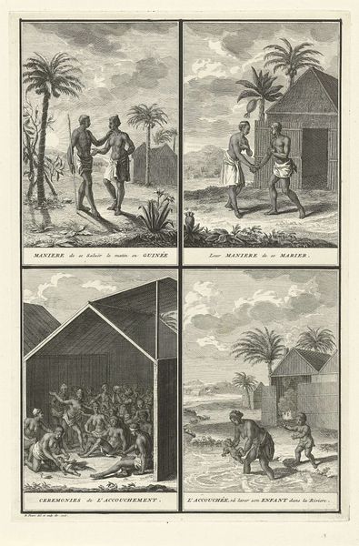 Editor: This print, titled "Gebruiken van inwoners uit Guinea" or "Customs of the Inhabitants of Guinea", created around 1727 by Bernard Picart, showcases various scenes in a linear, almost storyboard-like fashion. I find the stark contrast and linear details quite striking, but the depicted scenes also feel somewhat… staged, almost as though they're being presented for an audience. What story do you think Picart is trying to tell here? Curator: Ah, staged indeed! You’ve hit upon a crucial point. These kinds of images weren’t necessarily meant to be accurate depictions. Consider the period. What purpose do you think such a rendering of Guinea might have served in 18th century Europe? Editor: Hmm, maybe to exoticize the "other"? To portray them as…primitive? Curator: Exactly! The ‘Age of Enlightenment’ wasn't enlightened for everyone. Picart is appropriating imagery – or rather, fabricating it. This etching, while exhibiting masterful linework, relies heavily on European biases and limited understanding. What initially struck me about the print were the stark binaries: civilized versus savage, familiar versus foreign. Though, is it ever that clear? Editor: I see what you mean. The more I look at it, the more uncomfortable I feel. It’s like viewing someone else's misinformed idea of a culture, rather than a genuine representation. Curator: Precisely! It highlights the pitfalls of representation itself, especially when power dynamics are in play. That's not to say the image is without value. Editor: True. It gives insight to historical perceptions. Thanks for this! Curator: It’s been my pleasure; looking at this etching alongside you opened my eyes a bit more. Thanks!