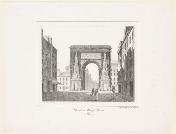Editor: We're looking at "View of the Triumphal Arch of Orange," a watercolor print made between 1856 and 1858 by Léon Auguste Asselineau. I'm immediately struck by how precisely the artist rendered the stone textures of the arch itself. What compositional elements stand out to you? Curator: Note the strategic employment of orthogonal lines receding into the picture plane, drawing the viewer's eye through the arch and into the distance. Observe how Asselineau used both warm hues in the foreground, drawing one's attention forward, with cooler tones to depict depth, and also, study how Asselineau orchestrates a contrast between the solidity of the arch and the subtle tonal variations in the surrounding cityscape. What impact does this tension have? Editor: I think that by contrasting the heavy stonework with lighter tones in the background, Asselineau draws our eye to the arch as the focus. Can you elaborate more on his application of watercolor as a medium in this work? Curator: Deliberate application of watercolor imbues this print with a peculiar ambivalence. The medium affords fluidity, yielding luminous effects of light and atmosphere. Conversely, consider the subject matter. It is not incidental that Asselineau elects to depict a Roman triumphal arch. What inferences can we make of that historical nod? Editor: Perhaps he sought to emphasize the enduring nature of civilization, contrasting with the ephemeral quality of watercolor? The visual harmony achieved through colour relationships is very pleasing. Curator: Precisely. I appreciate that you notice such details. Such tensions epitomize much of the Romantic style. It invites viewers to contemplate complex historical, cultural, and visual structures. I believe this conversation has changed my perspective. Editor: It's certainly provided me with a fresh perspective and a deeper appreciation for this seemingly simple landscape. Thanks for your expertise.