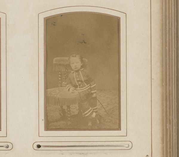 Curator: This is a gelatin silver print dating from between 1861 and 1874, "Portret van een kind, zittend op een stoel" ("Portrait of a child, sitting on a chair"). It’s currently held in the Rijksmuseum. Editor: Wow, that kid looks like they’re ready to rule the world, perched on that fancy chair! The expression is just priceless. There's something so innocent and imperious at the same time, you know? Like, "I’m adorable, but don’t you dare forget my royal status!" Curator: It is interesting how studios posed children with props to infer status during the 19th century. These types of photographic portraits allowed for broader representation than paintings. Note the elaborate, ornamented chair; it gives the child an air of importance, fitting into the tradition of stately portraiture while allowing accessibility. Editor: Totally! And you can almost feel the photographer trying to capture this fleeting moment of childhood. The slightly blurred edges and the sepia tone give it such a dreamy quality. But look at those tiny shoes barely peeking out from under the skirt—total rebellion! What do you make of the child's gesture, that slight lift of the right arm? Curator: It probably served to animate what was, inevitably, a rather static, constructed pose. Think about the historical context: photography was newer and subjects, especially children, needed direction. Movement helped make the subject more relaxed under those circumstances, but you can sense the constructed image struggling to become genuine. Editor: Makes me think about my own childhood pictures. So stiff and posed. No one looked natural, though we thought we did! Curator: Right! Early photography adopted conventions from painting, striving to present a refined image. And these were meant for specific viewers and to represent families in a certain way to broader society. Editor: Which makes you wonder about who got to see these, right? And what this family's social circles must have been like. Art that opens up those questions is the best kind. Curator: It truly is. These early photographic images reveal so much about how individuals and families wished to present themselves during a period of rapid social and technological change. Editor: And it also shows how little children have changed in wanting to make mischief regardless of circumstances. I see pure character here.