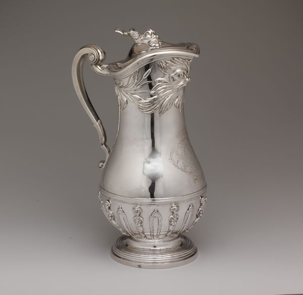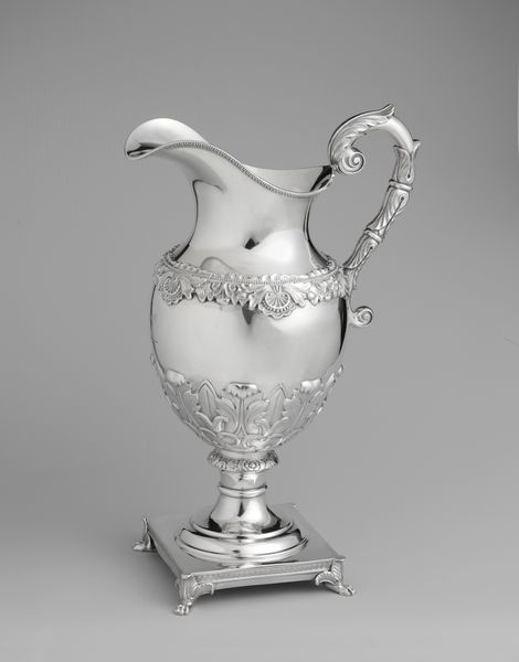 This pitcher, made by Cann & Dunn, is a testament to the beauty achievable through skilled silversmithing. The form of the pitcher, with its bulbous body and elegant, curving handle, was likely achieved through techniques like raising and hammering, requiring years of expertise to master. The surface is intricately decorated with chased and engraved designs depicting grapevines, adding visual interest and texture. Notice how the light plays across the polished silver, accentuating the depth and detail of the ornamentation. While we may admire the pitcher's aesthetic qualities, it's also worth considering the labor and social context surrounding its creation. Silver objects like these were luxury goods, often commissioned by wealthy patrons as symbols of status and refinement. The production of such items involved a complex division of labor, with specialized craftsmen and artisans contributing their skills to various stages of the process. By examining the materials, techniques, and social history embedded within this pitcher, we gain a deeper understanding of the rich tapestry of human creativity and the complex relationship between art, craft, and society.