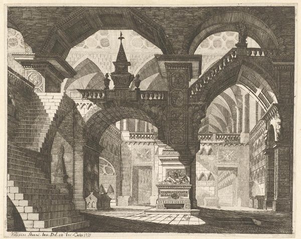 Editor: This is Vincenzo Mazzi's "Barrel-vaulted Interior with Coffered Ceiling and Sarcophagus in the Center." I’m really drawn to the architectural detail, it almost feels like a stage set. What do you see in this print? Curator: It’s like a Piranesi fever dream, isn't it? Mazzi conjures a space that feels both grand and claustrophobic. I imagine the sarcophagus as a sort of memento mori, a reminder of our fleeting existence, amplified by the never-ending staircases. What story might unfold here? Editor: That’s beautiful. It’s interesting how the architecture seems to both elevate and confine the viewer. I appreciate your connecting it to our mortality. Curator: Ultimately, Mazzi asks us to consider the spaces we inhabit, both physical and metaphorical, and to ponder their effect on our souls.
