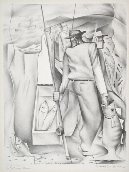Editor: Everett Gee Jackson’s print, "Sailor Take Care," from around 1933, depicts a sailor and a woman in what seems to be a moment of quiet intimacy. There’s something about the woman's downward gaze that creates a slightly melancholic mood. What social commentary might Jackson be making here? Curator: That's an astute observation. Given the socio-political context of the 1930s, during the Great Depression and on the brink of World War II, the print invites consideration of the artist's commentary on national identity and social roles. The composition prompts us to ponder how popular imagery shaped understandings of military service and domestic life. How do you interpret the symbolism of the title juxtaposed with their reserved posture? Editor: It feels cautionary, perhaps about the sacrifices and anxieties linked to military life during that era. The woman's passivity may symbolize the concerns of those left behind. Curator: Exactly! Now, let's consider the role institutions play in shaping these representations. Was Jackson engaging in overt political messaging, or simply reflecting prevailing cultural attitudes? Do you see it displayed as propaganda or perhaps a commentary? Editor: I think the artwork presents more subtle commentary. The fact that Jackson even produced art that references an enlisted man suggests he aimed to engage in the larger, even contentious debate of supporting those at war. I learned a lot by exploring its socio-historical context! Curator: And that intersectionality informs our interpretation! The ambiguity embedded in the piece reveals the power dynamics at play between national narratives and personal experiences during a complex historical period. I agree; seeing it this way enriched our appreciation.
