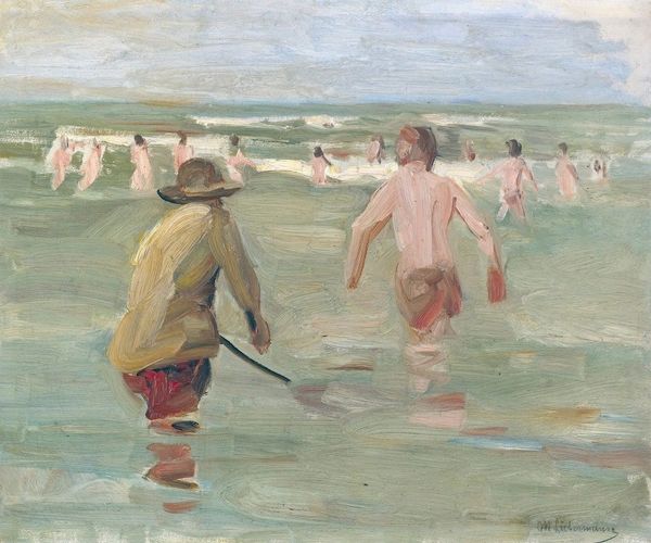 Edward Henry Potthast created this captivating beach scene with oil on canvas. Its muted palette evokes a nostalgic atmosphere. The composition is subtly divided horizontally, with the bustling shoreline meeting the serene expanse of the sea and sky. Potthast's brushwork is loose and impressionistic, capturing fleeting moments of light and movement. Notice how the figures are rendered with broad strokes, their forms dissolving into the surrounding environment, almost as if the artist were influenced by the Impressionists’ focus on the changing effects of light and atmosphere. In particular, observe how the interplay between the solid forms of the foreground figures and the blurred background generates a kind of tension which destabilizes the traditional figure-ground relationship. This shift invites us to consider how Potthast challenged conventional modes of representation, hinting at a more fluid, modern way of seeing the world. Such formal qualities are not just aesthetic choices; they reflect the complex and evolving dialogue between art and perception.