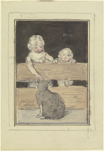 Curator: Skovgaard's watercolor and colored pencil work, "A Boy Sitting in a Cellar Doorway, Luring a Puppy," completed around 1844, strikes me immediately as tender, almost secretive. Editor: Absolutely, there's a definite mood of hushed intimacy. What fascinates me is how the texture of the brickwork contrasts with the softer treatment of the figures. You can almost feel the cool dampness of the cellar stones. Look at the deliberate way he uses the materials to create this sensation. Curator: The boy’s outstretched hand, the puppy tentatively approaching – these evoke classical symbols of invitation, the vulnerability of new beginnings. This also points toward broader concepts like connection. The setting becomes the visual vocabulary for intimacy. Editor: Precisely. The artist is showing us not just a sweet scene, but a world constructed from simple resources: pigment, paper, colored pencils. And note how the drawing, using modest means, levels any expectation for academic fine art. It emphasizes the universal appeal through direct engagement with accessible materials. The act of depiction is down-to-earth, connected to craft. Curator: Do you find something melancholic in the image? To me the darkness inside the cellar speaks of a space where imagination thrives, away from expectations. It feels like a visual metaphor for the Romantic spirit of the time. Editor: Perhaps, but I see something pragmatic here, too. The making of the artwork isn't trying to evoke drama but a slice of daily life. I think there's beauty in Skovgaard’s choice of depicting an everyday subject with the everyday materials. It says something profound about value of lived experience itself. Curator: That contrast, between everyday experience and romantic idealism, is where the power of the image lies, perhaps. I come back to how such a humble medium communicates to the universal search of innocent connection, childhood comfort, and new friendship, rendered so delicately and convincingly. Editor: It definitely transcends its materials and offers a compelling, relatable story. Considering Skovgaard used these commonplace means—watercolor and colored pencil—I find its impact surprisingly complex, showing us art's potential with minimal fuss.