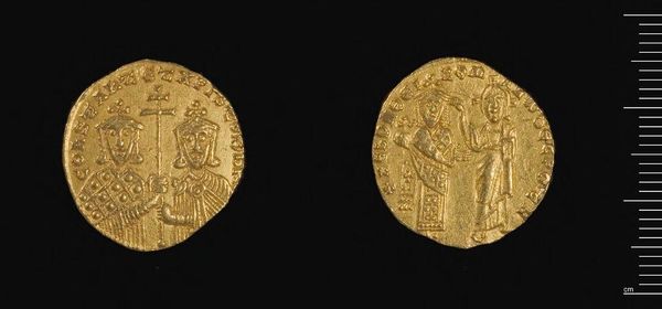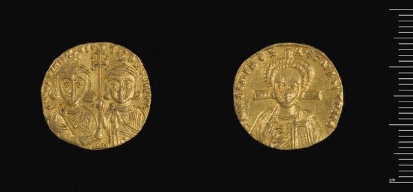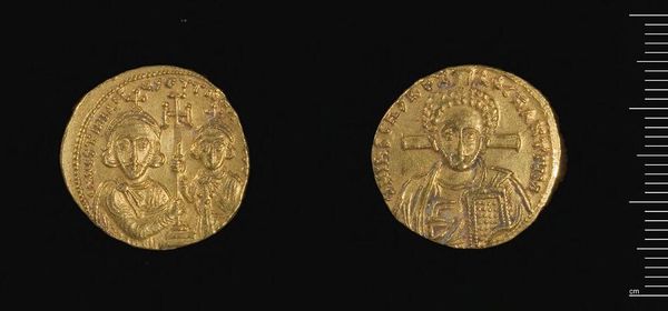 Editor: Here we have a Byzantine gold coin of Justinian II. It's very small, almost like a charm. The imagery seems quite powerful for such a tiny object. How do you interpret the symbolism on it? Curator: Well, consider the context. Coinage was a primary medium for projecting imperial authority. What do you notice about how Justinian II is depicted? Editor: He's presented as divine, with a cross and elaborate robes. It seems like he's intentionally crafting a specific image. Curator: Exactly! And by placing his image on currency, he's quite literally embedding that image into the everyday lives, the pockets, of his subjects. Editor: So, it's less about art and more about political messaging? Curator: It's both. The artistry is harnessed to reinforce the Emperor's power. It makes you think about the power of images in shaping perceptions and solidifying authority. Editor: That definitely shifts my understanding. It's fascinating how something so small could carry so much weight.