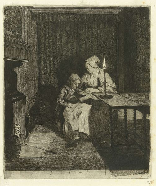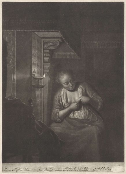 Curator: Richard Houston’s “Pen-cutter,” a mezzotint print, presents a figure absorbed in the meticulous work of quill trimming. Editor: There’s a somber, almost claustrophobic quality to this print, heightened by the stark contrast of light and shadow. Curator: The composition certainly reinforces that feeling, doesn't it? Note how the figure is framed by the darkened interior, emphasizing the tools and paper spread across the table. It draws our eye to the process. Editor: Indeed, but also to the labourer. Consider how this print positions the "pen-cutter" within a larger economy of print and manuscript production. What were the labour conditions of these workers? Curator: From a formal perspective, Houston masterfully uses the mezzotint technique to create subtle tonal gradations, achieving a remarkable level of detail and texture. Editor: Yes, but it's important to consider what the print elides, too – the unseen hands, the social structures that allow for such domestic scenes. Curator: An excellent point, revealing layers of complexity within this seemingly simple depiction. Editor: Exactly, viewing art as evidence reframes our understanding.