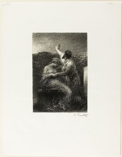 Editor: So, here we have Henri Fantin-Latour's "The Infancy of Christ: The Repose of the Holy Family," a lithograph from 1888. It's a pretty shadowy image, lots of dark tones. What I notice first is the angel figure sort of looming over Mary and the Christ child. How do you interpret this work? Curator: This piece invites us to consider the complex social and political context of the late 19th century, particularly surrounding religious representations and societal expectations of women. What do you make of the positioning of Mary, shrouded as she is? Is it devotional, or does it hint at something else? Editor: I see the piety in her pose, but also a kind of vulnerability, especially with the angels watching over them. It’s not just about divinity, but human fragility too. Curator: Precisely. Fantin-Latour was working within a society grappling with rapid industrialization and shifting power dynamics. By placing Mary in this protective but somewhat obscured pose, he seems to acknowledge both her sacred role and the societal pressures she would have faced. Notice the angel's action - almost a barrier? Editor: It’s like they’re not just venerating but actively guarding. Curator: Indeed. Perhaps guarding against a world where faith was increasingly questioned and traditional roles challenged. Think about the rising feminist movements of the time. This image, while seemingly traditional, might be subtly commenting on women's roles, protection, and the weight of societal expectations placed upon them, even the Virgin Mary. Does seeing it this way change your perception? Editor: It does! I was so focused on the religious aspect, I missed those layers. I see a lot more depth now. Curator: Art becomes powerful when it sparks those dialogues, when we actively place it in conversation with broader cultural forces.