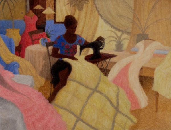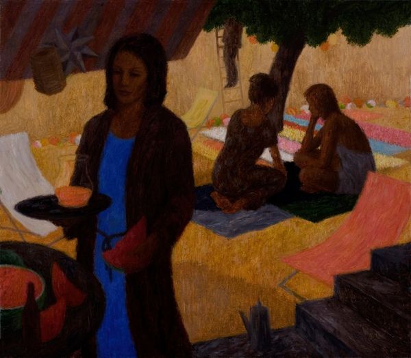 Iwo Zaniewski painted "Four Sisters and Mummy" with oil on canvas. The dresses and fabrics in this painting are rich with symbolic potential. The repeated presence of the figures draped in intricately patterned textiles evokes notions of identity, status, and the deeply personal rituals of mourning and memory. One cannot help but see echoes of classical drapery, reminiscent of figures in ancient Greek and Roman sculpture, where folds and fabrics communicate emotional states. But here, the reference evolves, shifting the emphasis to a communal space of shared grief and remembrance. Think about this room as an allegory for memory itself. The black color of the dresses, traditionally a symbol of mourning, may be seen as a potent force engaging viewers on a deep, subconscious level. It resurfaces, evolves, and takes on new meanings in different historical contexts, and points to the cyclical progression of symbols that transcend time.