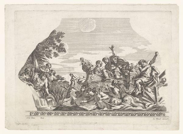 Curator: This engraving, dating back to 1636, is attributed to Pieter de Jode II. It's titled "Plate 35: Philip of Spain as Neptune, riding in a chariot drawn by two sea horses; from Guillielmus Becanus's 'Serenissimi Principis Ferdinandi, Hispaniarum Infantis...'" and we're fortunate to have it here at the Met. Editor: It's…intense. So much activity! All these fantastical sea creatures pulling and carrying Philip of Spain—or, well, the allegory of him as Neptune. There’s such detailed work in rendering textures. Curator: Absolutely. The Baroque period thrived on allegory and spectacle. This image was part of a larger publication documenting royal entries and celebrations. Consider how ephemeral these events were, existing only for a brief time; prints like this became crucial for disseminating political power and projecting an image of authority. Editor: It is fascinating how much detail went into immortalizing a singular political moment into something repeatable, for broader circulation. Look at the line work: the rippling water, the scales on the sea horses, the textures of those building facades. There's this interplay between representing reality and pure fantasy; this imagined procession blends into very real architectural backgrounds. I'd love to know how involved the workshops would've been for the engraver and how much that factored into final image we see here. Curator: Exactly! Prints like these served almost as early forms of political propaganda. Displaying wealth, control and power. Editor: Yes. Neptune with very contemporary Dutch architecture. It's almost a study of contrasts – timeless mythical figure juxtaposed with tangible depictions of place. But again, someone had to have meticulously created this matrix used to spread the image for years to come. That material process deserves notice as much as the royal connection. Curator: Indeed. By examining the circumstances around the artwork's production, including royal patronage and public events, we can understand how images solidified power structures during this historical moment. Editor: Well, I leave seeing the immense planning but even labor involved to produce prints to create or recreate such fleeting public celebrations! The artwork is as much about statecraft, I think, as it is a moment of intensive making.