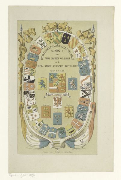 Curator: Here we have "The Most Holy Face of Our Savior Jesus Christ," a mixed-media print created sometime between 1833 and 1911 by Brepols & Dierckx Zoon. It's quite the narrative composition, isn't it? Editor: It is. I'm immediately struck by how much is packed into one image. Between the text, the central image of Christ, the flanking figures, and all the symbolic objects...it's almost overwhelming. What does this visual density tell us about the work? Curator: Exactly! Its density points us towards its public role. Prints like this were widely disseminated, offering not just a devotional image, but also a form of instruction and moral guidance accessible to a broad audience. Think about where such a print might be displayed – in a home, a small chapel perhaps – and how its symbols become a regular part of the visual landscape. Editor: So, its value wasn’t just artistic; it served a social function? Curator: Precisely. And note the language – Dutch on one side, French on the other. Belgium was undergoing significant national identity formation during this period, finding itself wedged between different cultural and political spheres. Prints like these reflect a deliberate attempt to connect with multiple audiences, to solidify a shared, religiously informed identity, but also demonstrating some tension regarding regional culture. Editor: That makes the bilingual text feel more deliberate, less like a simple translation. So, how might understanding the historical and cultural context change the way someone sees this image today? Curator: By revealing the layers of meaning embedded within. It shifts from simply a religious image to a complex document reflecting socio-political realities, print culture, and the public role of religious imagery. It encourages us to ask, what stories does this seemingly simple print reveal? Editor: That’s fascinating. I definitely see the artwork with fresh eyes!