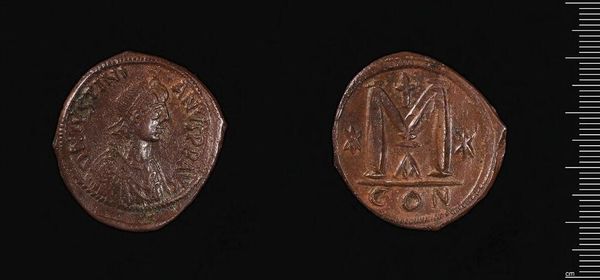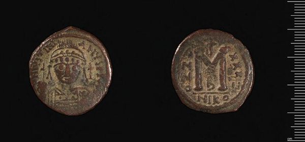 Editor: Here we have a copper coin by Justinian I. It's amazing how much detail they fit on such a small surface! What strikes you about its composition? Curator: The coin's design presents a compelling interplay between figuration and abstraction. The portrait, though worn, displays a clear attempt at verisimilitude, juxtaposed with the stylized "M" which dominates the reverse. Note the deliberate texture achieved through the engraving; its semiotic function conveys power and authority. Editor: So, it's not just about the images, but also how they are rendered? Curator: Precisely. The physical crafting of the coin—the deliberate tooling marks and the coin's patinated surface—contributes to its overall meaning and aesthetic impact. Do you see how the incised lines create depth? Editor: I do now! There’s more to this coin than meets the eye. Curator: Indeed, and by analyzing the formal elements, we can begin to decode its deeper cultural significance.