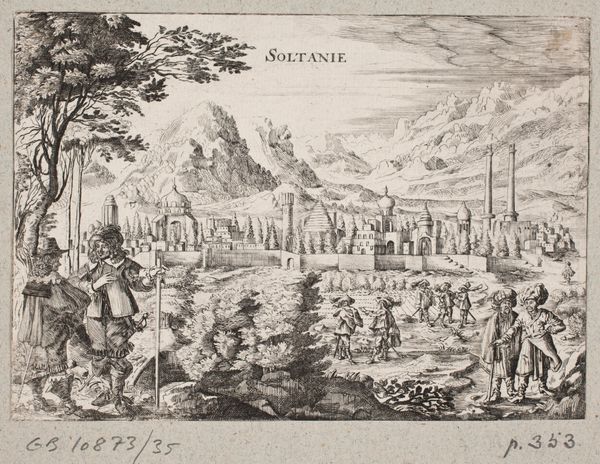 Curator: This print from 1572 is entitled "The Lighthouse at Alexandria" by Philips Galle. What strikes you first about it? Editor: The almost frantic energy! It's so busy, with incredible detail, all rendered in fine lines. The eye just darts around, trying to take it all in – the boats, the buildings, the figures in the foreground... it's a feast for the eyes, in a rather chaotic way. Curator: I'd say the context of its creation certainly influenced its style. Galle, an engraver and printmaker active in the bustling port city of Antwerp, would have witnessed firsthand the labor, trade, and increasingly globalized world. His workshop, a hub of artistic production, shaped how he, and by extension this print, understood the world. Editor: Absolutely. Let's zero in on the lighthouse itself. Notice how its form, a spiraling, almost baroque tower, dominates the cityscape. Galle's masterful handling of line creates a real sense of volume and depth. Curator: That monument’s materiality tells a great deal about resource management and status. The labor required to erect that structure—to quarry, transport, and assemble the stone, speaks to an extraordinary feat of engineering. It underscores the relationship between the lighthouse and those in power, how control over resources allows one to create a monument that both aids and dominates its surrounding. Editor: I agree, there is this real interplay between function and grandeur. Thinking formally, though, notice the way the swirling clouds echo the form of the lighthouse, unifying the composition? The strategic placement of the Pharos atop the rocky island establishes a focal point. Curator: But it's not just an aesthetic exercise, it shows power! That lighthouse represents safety and control over maritime trade, vital arteries of 16th-century commerce. Prints like this one had a market value; it speaks volumes about that economic relationship with classical antiquity. Editor: It all boils down to visual language. That Philips Galle presents this structure—as imposing as it seems from our perspective—speaks volumes about this object’s cultural relevance. Thanks to him, and others like him, we get to experience the world through this unique looking glass. Curator: Exactly! This print prompts us to consider both the enduring legacy of ancient marvels and their intersection with labor, the economy, and trade—the conditions and the cost of how we choose to define civilizations through symbols of material prowess. Editor: Yes. The Lighthouse, beyond the visual drama and historical value, pushes us to contemplate humanity’s capacity for ambition. It makes you wonder: what will the symbols of *our* ingenuity look like centuries from now?