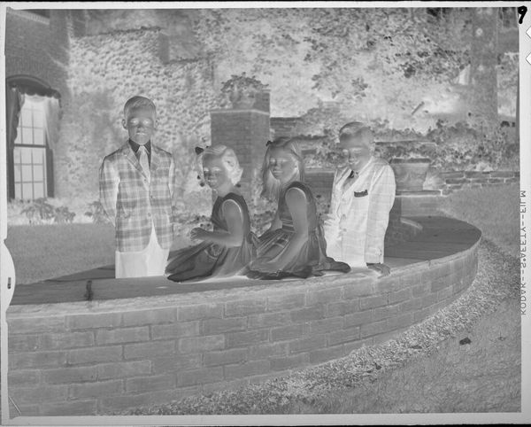 Curator: This photograph, "Untitled (three boys sitting on brick wall)" by Lucian and Mary Brown, captures a seemingly simple moment in time. It's a small gelatin silver print, just a few inches in size. Editor: It’s striking, almost eerie in its inverted tones! Their smiles seem… otherworldly. I’m immediately drawn to the texture of the brick, though. Curator: The lack of a title invites us to consider the universal experience of childhood, perhaps, and the dynamics of play and camaraderie within specific socio-economic contexts. Editor: Absolutely. There's a sense of shared joy, but also maybe some vulnerability? The negative format enhances the contrast and draws attention to their expressions, and gives me a nostalgic feeling. Curator: Perhaps the artists aimed to capture a fleeting moment of respite amidst the complexities and constraints imposed by race, class, and social expectations of the period. Editor: That’s an interesting point. I suppose the photograph, even in its simplicity, is a profound cultural artifact that speaks volumes. Curator: Indeed, it invites further examination into the historical landscape of identity and representation. Editor: Yes, it's made me think about resilience and the complex layers of childhood!