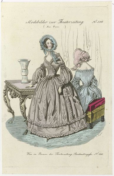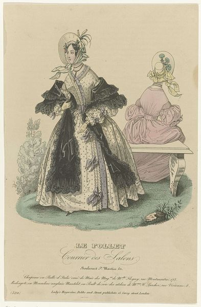 Curator: This print, titled "Le Follet Courrier des Salons, 1837, No. 569" depicts the fashion of its time with a remarkable focus on the details of attire. It’s fascinating to examine how form defines status in this era. Editor: The overwhelming frilliness! So many puffs and flowers, it's all fabric, structure and ostentation—how much would this thing weigh? I'm drawn to the sheer labour embedded in such finery. Curator: Indeed! Consider how the visual language emphasizes specific lines, creating a distinct silhouette. Note how the rounded forms of the bonnet, the sleeves, and especially the dress's voluminous skirt repeat in a calculated manner. It almost perfectly aligns with the romantic era ideal. Editor: And all that intricate detail…it speaks to the immense labor required. This wasn’t fast fashion. Someone painstakingly stitched every Marabou and puff in that garment. The social context surrounding its creation must be crucial to understanding its significance. Curator: Absolutely. The visual elements work together, too. Observe the pastel color palette, from the blush-pink gown to the pale-blue dress in the background, contributing to the overall impression of delicate refinement and a sort of dream-like innocence. Editor: And what about accessibility? Such craftsmanship and obviously rich materials suggest that these fashions, as depicted, were attainable only to a small, privileged segment of society, which, of course, tells another story of consumption in 1837. Curator: You raise an important point. Semiotically, these details function as signifiers, communicating the wearer's social standing. Each design choice carries cultural weight and serves a symbolic purpose, indicative of aspirations and social conventions. Editor: Ultimately, beyond its symbolism or structure, for me, this image brings into focus the many hands involved in its making. I think a materialist approach allows one to delve more deeply into the processes of its creation. Curator: A valid point; together we have highlighted the romantic essence of the image, along with the detailed formal design and rich materiality! Editor: Yes, examining both the craftsmanship and the wider socio-economic setting gives depth to understanding it.