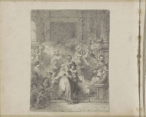 Curator: What we have here is Robert Pollard's "Vauxhall Gardens in London," an engraving from 1785. It really offers us a glimpse into a world gone by. Editor: It feels overwhelmingly populated, doesn’t it? Everyone primped and preened and crammed together. A fancy, outdoor ant farm! Curator: Vauxhall Gardens was a huge public attraction, a commercial venture aimed at everyone, mixing classes. That's reflected in the image, a space buzzing with people wanting entertainment and to see and be seen. Editor: I wonder what those melodies drifting from the orchestra sound like. Are people genuinely enraptured by the music or are they mostly there to show off their latest silks and feathered hats? It feels performative even without the stage. Curator: Exactly! It was as much about social networking as artistic appreciation, like a Georgian version of a bustling town square. Note the architecture too—those playfully ornate pavilions offered more than just shelter; they symbolized a cultured society. Editor: But there's something bittersweet here too. The artificial lighting, those pruned trees… it's nature manicured and controlled. Is it paradise or just a gilded cage? Even in ‘nature,’ the people seem to abide by rules! Curator: Good eye! The gardens walked a fine line, offering natural retreat, while reinforcing social decorum and even promoting the power structure. Those architectural boxes within boxes mimic the rigid hierarchical boundaries within 18th-century London society. Editor: It makes me wonder if the promise of escape and the joy are a thin veil. Maybe the etching's black and white enhances that…there’s no denying there's a definite lack of colour! Curator: Certainly. Pollard has captured a fascinating microcosm. His image lets us ponder the interplay of nature, culture, and the carefully constructed performance that defined that particular time and place. Editor: So next time you feel like hiding away in a public garden, maybe remember all the politics and artistry woven into what seems like an innocent walk in the park.