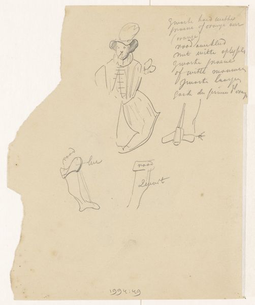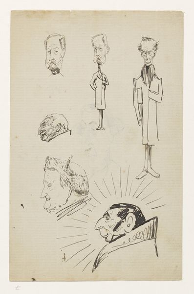 Curator: Let's discuss "Satirical Sketches," attributed to George Cruikshank. It appears to be an ink drawing, with several figures sketched across the page. My immediate impression is one of organized chaos. There's a raw, unfiltered energy here. Editor: I see it too—the frenetic line work immediately suggests it was made rather quickly, maybe even spontaneously. The quality of the ink suggests a standard iron gall ink, readily available at the time for sketching and personal use. Notice how the variable line weight communicates form effectively with minimal effort. Curator: Exactly. Considering Cruikshank’s reputation, especially his commentary on social ills through caricature, it makes me consider which segments of society might be targets of this particular sketch. The figure with the devil horns and a weapon…is that a symbol of corrupt power? The bloated face leering over the desk…is that an indifferent banker, or perhaps a politician? Editor: That’s an astute reading. But looking at it purely from a production perspective, I'm drawn to how this image might function in relation to his larger body of work. Could this be a preparatory sketch for a more elaborate print? How did he use these initial drawings to inform the final, mass-produced product that reached a wider audience? Curator: That’s crucial because mass production changes the relationship to the audience! If this sketch is, in essence, a precursor, we have to consider Cruikshank’s readership, the political landscape they inhabited, and his role as a commentator—perhaps even as a catalyst for change within the cultural sphere. Was he truly subversive? Did his illustrations reflect or shape the evolving attitudes toward class and governance? Editor: Those questions lead me to wonder about Cruikshank's own socio-economic status as an artist, and his connection to the engravers and printers who materialized his sketches into salable artwork. Was he merely catering to popular opinion or deliberately trying to subvert societal norms, given that his livelihood depended upon public acceptance? Curator: Right. It reminds us that we must unpack layers of meaning, intent, and the surrounding cultural context to approach the artwork fully. The ink itself, the pressure applied, even the choice of paper: all speak to this nexus of creative and social forces. Editor: Yes, this single sketch, with its rapidly applied lines, tells a much broader story. Analyzing both its physical and societal materials enhances its artistic impact. Curator: A compelling insight—I will consider those societal production aspects when approaching this piece in the future. Thank you for providing a materialist viewpoint on the complex context of its execution!