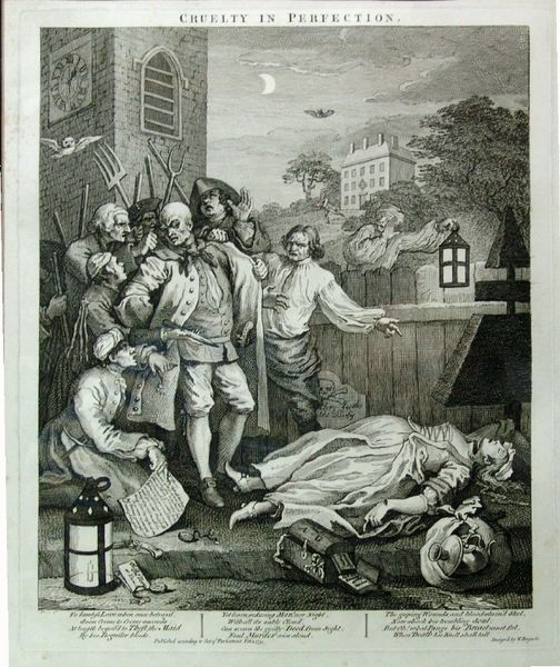 William Hogarth’s print, "Cruelty in Perfection" likely made in the 1750s, presents a shocking scene of urban violence and moral decay. It is a visual indictment of the social conditions in 18th-century England. Hogarth uses stark imagery to depict the brutal climax of a life marked by cruelty. The setting, a dark and squalid street, reflects the grim reality of the period’s urban underbelly. We see an unrepentant criminal being seized while his victim lies dead at his feet. The artist evokes the cultural associations of criminality, poverty, and moral depravity. The presence of money bags suggests the economic motivations behind the violence. Hogarth's work often served as social commentary, critiquing the institutions and social norms of his time. To fully appreciate the print’s meaning, one can delve into London’s criminal history and examine the popular literature that often moralized violence. "Cruelty in Perfection" challenges viewers to confront the uncomfortable truths of their society.