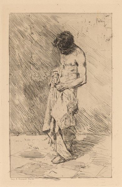 Editor: This is Ernest Rouart's "Woman at Her Toilette," a drawing, or perhaps a print of a drawing, in pencil. It feels like we are intruding on a private, almost sacred moment. What visual echoes do you see in this piece? Curator: The immediate symbol that strikes me is the mirror, the *vanitas* emblem. Throughout art history, the mirror symbolizes vanity, yes, but more subtly, self-knowledge and the fleeting nature of beauty and life. Here, Rouart doesn't give us a clear reflection, the face is obscured; it evokes a searching inward, the performative act of readying oneself and facing her true identity. Do you get that sense? Editor: I do now. It makes me think of those old myths where a glimpse into a mirror has powerful, sometimes dangerous consequences. Curator: Exactly. Think of Narcissus, or even Snow White's stepmother! Rouart's woman isn't necessarily vain, but engaged in a ritual, fraught with anticipation. What future self is she crafting in this moment? The pitcher next to her adds another layer: water as purification, or potential for transformation, a symbol echoed across religions. Editor: I see how these commonplace objects are transformed into potent symbols! Curator: Even her pose - head bowed, hand touching her leg - evokes vulnerability but also self-possession. Notice how the artist positions her just so to draw attention to gesture; it is like a language almost forgotten. What did you find surprising about the work after our discussion? Editor: I came in thinking this was simply a peek into a boudoir, but now I see a much deeper conversation about identity, ritual, and how women see themselves. Thanks for sharing your insights!