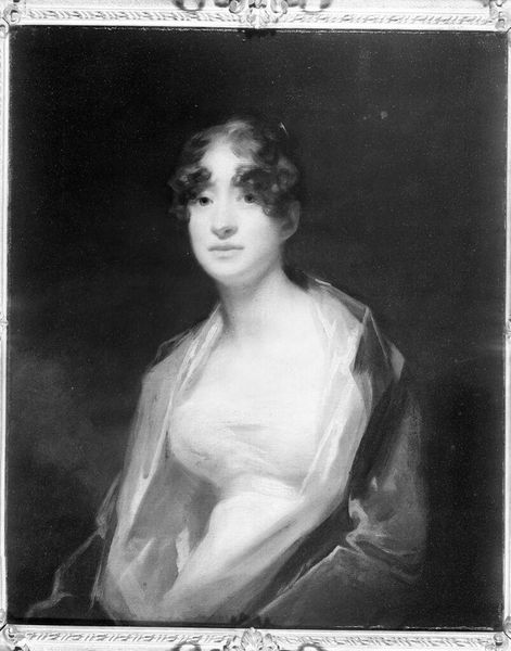 Curator: This is "Elizabeth Bushby," a miniature portrait rendered in ink on paper by Andrew Plimer, dating back to 1804. Editor: What strikes me is how contained yet evocative it is. The monochrome palette gives it a sense of austerity, but her expression hints at something more complex, a quiet defiance perhaps? Curator: I'm interested in the materials and process involved in creating such an intimate object. Plimer would have painstakingly built up the image with layers of fine lines and washes, the labour intensive method resulting in an object that would have been cherished, passed between family members and loved ones. Editor: Exactly! It’s not just an image, but a carefully crafted object of social and familial importance. Consider the sitter, Elizabeth Bushby, situated within a society that prescribed very specific roles for women. The portrait then becomes a vehicle for exploring issues of identity and representation. Was this a commissioned piece intended to solidify social standing or did it act as a form of personal memorial? Curator: The lack of colour forces one to look more closely at the nuances of line and shading, the visible evidence of the artist’s hand. What does it mean to depict someone with such starkness in contrast to the opulent lifestyles often associated with portraiture? It's fascinating to ponder the economics of such commissions. Who were Plimer's patrons and what access did ordinary folk have to such craftsmanship? Editor: And what is she *not* telling us? Think about the power dynamics at play. While Plimer's technical skill is evident, so is the implied gaze of the male artist representing a female subject, how do we unpack the dynamics of subject/object in terms of control? Curator: The almost jewel-like quality of the miniature invites questions around commodity and display - How accessible would this object have been, where might it have been kept and worn, if at all? Editor: Absolutely. Examining miniatures as commodities is fascinating; objects that spoke to shifting social structures while perhaps upholding existing structures of privilege. This is where we might consider not just her individual likeness but wider societal power relations inherent to portraiture during the period. Curator: These miniatures serve as vital insights into material culture, acting as valuable entry points to broader socioeconomic histories. Editor: It truly exemplifies the powerful ways in which art engages with personal stories alongside critical cultural discourses.