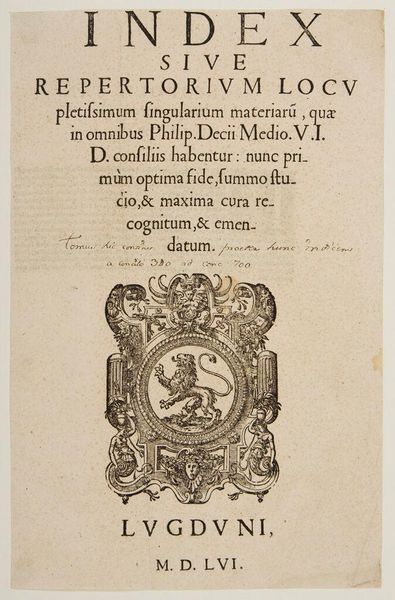 Curator: This is the Printer's Mark used by Ambroise Drouart of Paris, and after 1608, his brother Jérôme. It's an unsigned piece, likely from 1609, reflecting the visual language of the era. Editor: It's striking! The dense, symmetrical composition, the cherubs, and the central thistle-like plant all contained within this elaborate oval make it feel quite imposing despite its probable small size. Curator: Indeed. Printer's marks were crucial visual branding, especially during a time when literacy was still growing. This one conveys both authority and a connection to classical learning through its imagery. Editor: Look at the line quality! The engraver has such incredible control, creating a real sense of depth and texture. The way the light catches those little cherubs is exquisite. Curator: Absolutely, and the symbolism would have resonated. The thistle, surrounded by the Latin motto "Forte Pattere Aute Absitine," suggesting "Suffer Bravely or Abstain Altogether," speaks to the printer's commitment to quality. Editor: It really pulls you into the world of early printing and bookmaking. Makes you appreciate the artistry involved. Curator: Precisely, it's a fascinating glimpse into the cultural values embedded within early publishing.