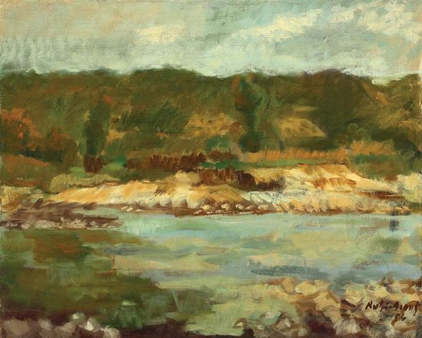 Curator: Take a moment to observe "Spring," painted in 1915 by Konstantin Alexeevich Korovin. What impressions strike you first? Editor: The palette! That muddy, thawing color scheme says a lot about the materiality of the environment itself at this time of year. Everything is breaking down, melting, flowing. It's a very tactile scene, almost dirty. Curator: Exactly! The "dirtiness" holds the potential for new growth, a cyclical churn masterfully captured. Korovin’s broken brushstrokes beautifully reflect nature awakening after the cold grip of winter. Editor: Look at how those strokes accumulate—the tangible oil paint building up into reflections, dissolving ice. Korovin isn't just depicting a landscape; he's showcasing the physical properties undergoing transformation. Did he build his own paints? Was he preoccupied with industrial dyes as opposed to natural colors? Curator: That's fascinating. To me, it's about the pure emotional experience, the trembling hope in the air as spring unfolds. The subtle gradations, those muted blues and greens, invite a meditative, reflective mood. Editor: Right, and by understanding the constraints and opportunities afforded by his chosen materials – oil paint and likely commercially produced canvas – we can better appreciate what he could express and what he chose to emphasize. The limitations become part of the art. Curator: So true, that tension informs our reception. What at first might appear simply scenic is, in actuality, laden with physical and philosophical tension. I come back to the thaw... not just in nature, but perhaps within us as well. Editor: Yes! Maybe it invites a reassessment of our own relationship with labor and natural resources and the very landscape we move through. Curator: This is definitely a painting that lingers and echoes beyond the surface.