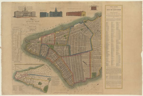 Curator: I’m struck by the tenderness in this map, this "Plattegrond van Amsterdam" from 1837-1839, created by Daniël (II) Veelwaard. It’s so meticulously rendered as a print. You can practically smell the canals, can’t you? Editor: Absolutely, it’s charming. It feels almost… friendly, for a city plan. Not sterile or clinical. I like the romantic wash of colors, dividing Amsterdam into distinct districts. What was the impulse for making it this way, and what’s its significance, placed within a collection? Curator: I find this plan so interesting, precisely because it humanizes the city. During the early 19th century, Amsterdam was grappling with significant changes and this work presents the city to its citizens in a way that feels accessible, legible. Veelwaard uses color coding, labeling different quarters as if they're old friends to be remembered and celebrated. Editor: I notice a strange mix of exactitude and emotion in it, too. Those precise lines suggest the Enlightenment, yet those soft, almost pastel hues… and all the empty spaces that speak about open opportunities on this harbor tell an opposing tale. Like the beginning of mass printing gave ordinary folk a chance to buy property. Curator: Exactly! Mass-produced city plans became vital in the Netherlands. This wasn't just a map; it was a statement about ownership, progress and place, which could appeal to a wide audience and fuel urban and rural speculation about rising market opportunities. Editor: Thinking about who engaged with these items at home or work also excites me. It's very satisfying. Seeing where people place themselves as parts of larger processes; Veelwaard seemed to capture it perfectly for Amsterdam at that moment! Curator: I completely agree. There is something deeply resonant about this representation, offering its viewers, from nearly two centuries on, not just geography, yet a sense of ownership over a changing metropolis. Editor: A wonderful convergence of the rational and the romantic indeed! This feels special and really speaks volumes to what has passed!