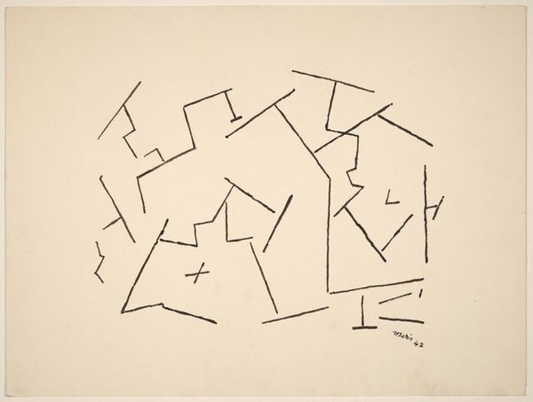 Editor: Here we have Howard Mehring's "Untitled" from 1976, an ink drawing. It's minimalist in a way, just a few black lines on a light background. It feels almost like a sketch or a preliminary study. What's your take on it? Curator: This piece offers a valuable glimpse into artistic production. Looking at the materials—ink, paper—and the deliberate yet seemingly spontaneous application, what can this tell us about Mehring's process? Is it a rejection of high art formality? Consider the labour involved; each stroke a conscious act. Editor: It does feel very immediate, like the artist was working quickly and intuitively. The lines overlap and intersect. It looks like a geometric figure trying to come into focus. Do you think that reflects something about the artistic context of the time? Curator: Absolutely. Post-war art was consumed with redefining the boundaries of artistic practice. Think about Minimalism's challenge to traditional sculptural forms through industrial materials. In a similar vein, here the supposed ‘lack’ of traditional subject matter challenges notions around what constitutes art. How might Mehring’s access to specific materials like high-quality inks or papers have influenced the final product? What are the socio-economic factors involved? Editor: That’s fascinating. I hadn't thought about how the materials themselves could be a statement. I suppose that focusing on process kind of democratizes art making. Curator: Precisely. It shifts our gaze to the act of creation, questioning established hierarchies of skill and subject matter, bringing it down to the material conditions and labour that made the artwork. Editor: This has given me a completely new lens through which to view abstract art. I am so much more attuned to artistic processes now! Curator: Indeed. Seeing art through a materialist lens is all about appreciating how it exists not in a vacuum but within very specific networks of production and consumption.
