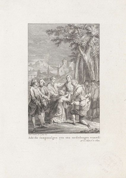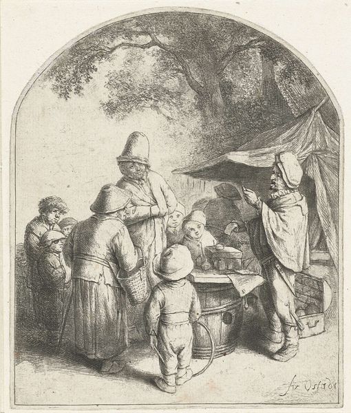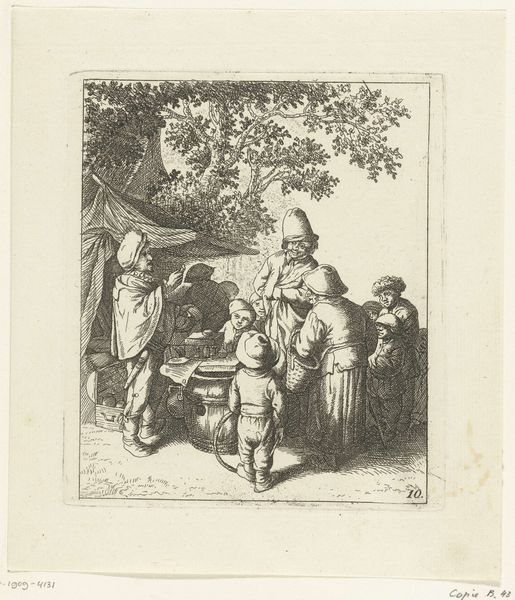 Editor: We're looking at Jan Both's "Het Gezicht," dating from sometime between 1620 and 1638. It's an etching, so a print, currently held at the Rijksmuseum. My initial impression is of organized chaos; a group of figures clustered together, and their expressions and poses seem almost theatrical. What catches your eye when you look at it? Curator: Formally speaking, I'm drawn to the intricate network of lines that comprise the image. Consider the varying densities and directions. See how they sculpt volume, define textures, and articulate spatial relationships within the composition. Ask yourself, how do the strong diagonals and verticals create tension and balance, directing the viewer's eye around the scene? Editor: So, not necessarily what's happening in the image but more about how the image itself is made? Curator: Precisely. For instance, observe the use of light and shadow. It isn't merely representational. Instead, light emphasizes certain aspects, such as the faces, while shadow conceals and adds depth. Notice the formal rhythm across the composition, that directs the audience towards particular subject matter. Do you think the texture created adds or detracts from the subject matter? Editor: I think it certainly adds! The etching seems very detailed, particularly for something so old, but also has depth from the way shadows were used, which adds a narrative aspect to it that could not have existed as strongly without the form. Thank you for showing me what to appreciate about the artistic elements of this image! Curator: It’s the visual language itself that conveys meaning. Close looking will show you that every detail is significant in baroque artworks like this one!
