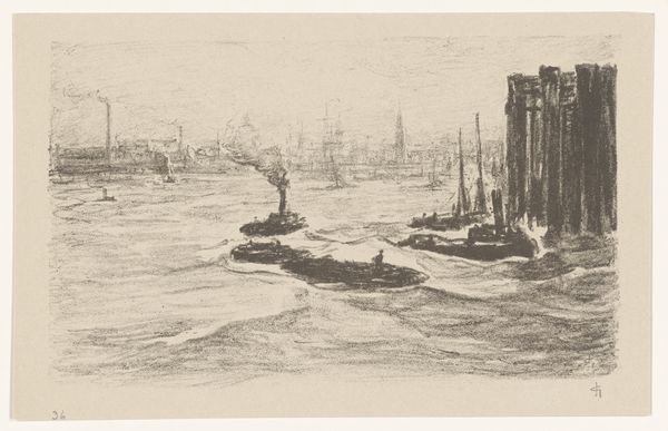 Editor: This sketch, titled "Schepen op de Maas in Rotterdam," believed to be made sometime between 1888 and 1934 by Willem Adrianus Grondhout, uses ink and pencil to depict a harbor scene. What immediately strikes me is the contrast between the loosely sketched, almost chaotic, linework in the foreground and the slightly more defined structures in the background. What can you tell us about this piece? Curator: Considering this work from a materialist perspective, let’s first address the chosen media: ink and pencil. These are readily accessible, relatively inexpensive materials. Their use here, coupled with the sketch-like quality, suggests a focus on process, on the act of seeing and recording, rather than a polished finished product destined for a high art market. Does the “incomplete sketchy” nature signify the artist's social or economic standing and relationship to art as labor? Editor: That's interesting! So, the choice of readily available materials points to accessibility and perhaps a specific socio-economic context for the artist's practice? Curator: Precisely! The cityscape depicted reflects the growth of Rotterdam as a port. Consider how industrial development provided opportunity and wealth but also entailed immense physical and societal labor. How does the work mediate the boundary between "fine art" and craft in depicting labor and infrastructure, for instance? Does this sketch, through its raw and immediate quality, challenge traditional notions of artistic skill and value within a rapidly industrializing society? Editor: So, it's not just a cityscape, it's also commenting on the labor and materials that create that cityscape. I never thought about art in that way! Thanks for showing me new ways of looking. Curator: My pleasure. Considering art in the context of production and the realities of material existence provides many insights into cultural values.