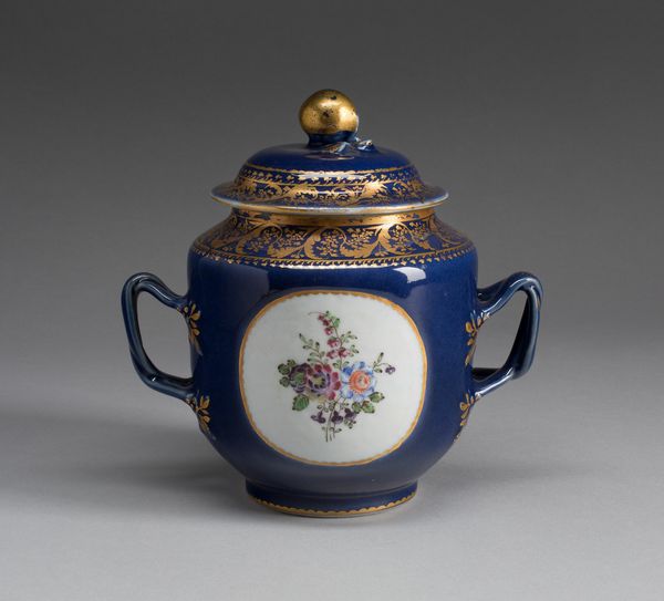 Curator: Here we have a teapot, part of a larger service, crafted by Coalport sometime between 1870 and 1886. The porcelain shimmers with a vibrant, gilded surface, doesn’t it? Editor: It does! My initial reaction is one of pure opulence. The gold against that vibrant blue…it almost feels aggressively luxurious. Curator: Precisely. The bold color choices certainly dominate. If we analyze the interplay, the cobalt bamboo stalks reaching upward direct the viewer’s eye toward the lid, drawing a distinct verticality that is balanced against the rounded form. Editor: But that’s where it gets interesting, doesn’t it? Porcelain production, even in the late 19th century, carries the legacy of colonialism and the exploitation of resources and labor in East Asia. This British-made teapot with East-Asian inspired motifs...it feels like a trophy of sorts. Curator: An intriguing point. However, considering the pattern's deliberate use of asymmetry, avoiding exact mirroring, highlights the artistry involved, and focusing purely on the sociopolitical diminishes the craftsmanship, doesn’t it? Look at the exquisite brushwork used to render each bird in flight. Editor: I agree, there's skill involved, undeniably. But consider the bamboo motif itself – often symbolic of resilience and flexibility in Chinese art and philosophy – here it's merely decorative. It's been divorced from its original context, re-appropriated as ornamentation for Western consumption. Doesn't that loss of meaning become a part of the work's narrative? Curator: A compelling thought, indeed. Perhaps this "Tea Pot" exists within a broader spectrum of cultural exchange, a decorative yet complex historical artifact. Editor: Yes, this beautiful object opens a conversation about cultural power, commodity, and the enduring echoes of imperialism that continues to shape and redefine aesthetic conventions today.