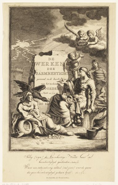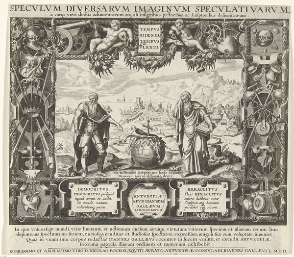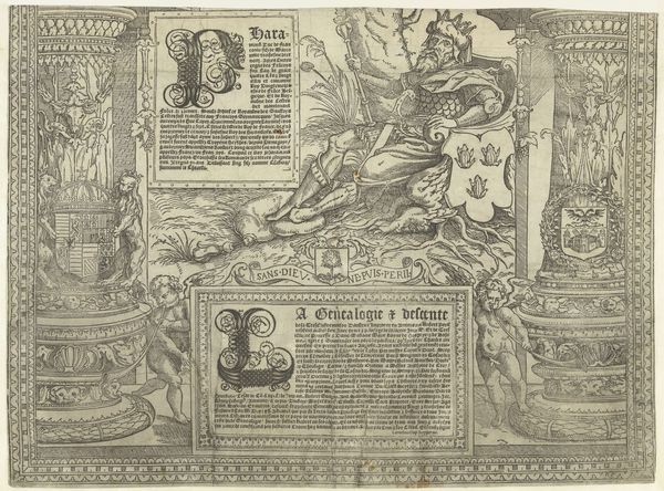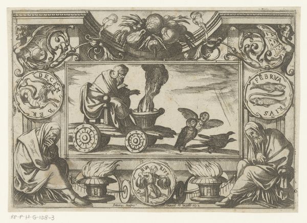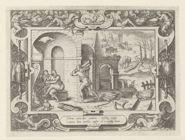 Editor: This engraving, "The Story of Dinah and Shechem" by Harmen Jansz. Muller, created between 1567 and 1570, strikes me as intensely symbolic. The central figures and surrounding objects appear to convey a moral message. How do you interpret this complex scene and its relationship to the socio-political context of its time? Curator: The engraving certainly reflects the anxieties of the period. We must look at it not just as a historical illustration but as a commentary on the power dynamics of the 16th century. Engravings like these were often commissioned or circulated to promote specific ideologies, especially during periods of religious or political upheaval. Who controlled the narrative, and how did they use imagery to shape public opinion? Editor: So, the artist’s choices - like the figures, the text boxes surrounding the composition, and maybe even the city in the background- might be reflecting these dominant views? Curator: Precisely! Consider the intended audience for this print. It likely circulated among educated elites. The artist uses classical allusions, biblical narrative, the borders depicting the consequences and outcomes in this context were tools to persuade them of a particular moral or political stance. It begs the questions, did art like this reinforce or challenge established power structures? Editor: That makes a lot of sense. Looking at it now, the city becomes much more than just a backdrop; it is integral to understanding what messages were being put forth. Curator: And don't overlook how the print's physical circulation contributed to its impact. Prints were relatively accessible, which provided artists a wider audience than paintings afforded. How does the rise of printmaking intersect with the changing roles of artists and the public sphere? Editor: I hadn't thought about that connection. Thanks, now I see how understanding the history surrounding the work adds layers of meaning. Curator: And I learned how important the material reality of the print is to your generation. The layering and complexity provides depth beyond the historical and cultural references!