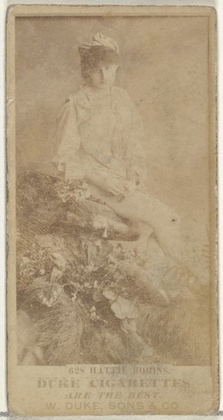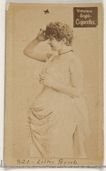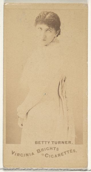 Editor: Here we have "Luella Fisher, from the Actors and Actresses series" created between 1885 and 1891 by Allen & Ginter, now residing at The Met. It's fascinating to see this photographic print, almost like a faded dream. The sepia tones lend it an air of nostalgia. What captures your imagination when you look at this? Curator: What whispers to me is the unexpected elegance tucked into what was essentially cigarette packaging. Can you imagine finding this beauty amidst tobacco? It speaks of a time when even everyday objects sought a connection to artistry. Think about Luella herself, caught in this delicate dance between public image and commercial promotion. It raises all sorts of questions, doesn’t it, about celebrity and consumption, then and now. And look closely, do you see that hand-tinting, that gentle blush of color on her cheek? Editor: Yes, I see it. It's a subtle but powerful detail. So, it’s more than just a simple portrait, it’s like a commentary on the era. Curator: Exactly! It's a snapshot, literally and figuratively, of a moment where entertainment, art, and advertising intertwined. Makes you wonder what Luella thought of it all. Was she in on the game, or simply a face for someone else's profit? Food for thought, isn't it? Editor: Absolutely. It's definitely made me look at it with fresh eyes. Curator: Wonderful! Sometimes, the most unassuming objects hold the biggest stories. It’s all about asking the right questions and listening to the echoes of the past.