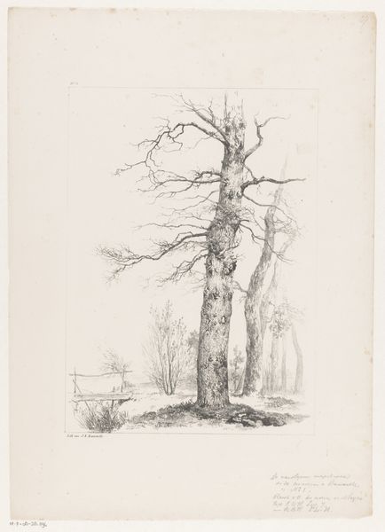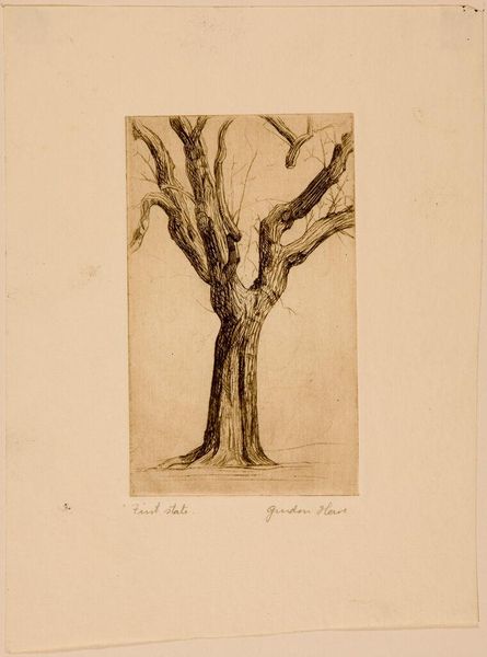 Editor: This is Joseph Jablonski’s "Study of a Tree," presumably from 1925. The intricate linework creates a stark, almost desolate scene. What formal elements stand out to you? Curator: The stark contrast between the stark, bare tree and the precise architectural rendering is striking. Observe how the branches reach upwards, a play in asymmetry against the rigid lines of the buildings. What do you notice about the artist's choice of perspective? Editor: The tree dominates the composition, yet the buildings provide a structured backdrop. I hadn't considered how the asymmetrical tree contrasts with the rigid buildings. Curator: Precisely. The composition invites us to consider the relationship between the organic and the geometric, the natural and the constructed. Editor: This gives me a completely different perspective on this work. Thanks!