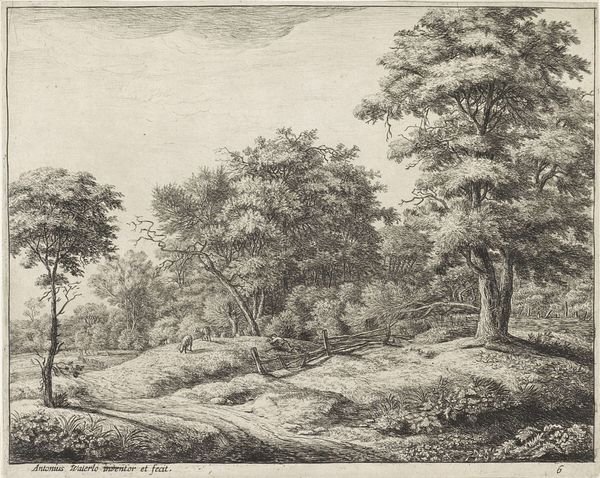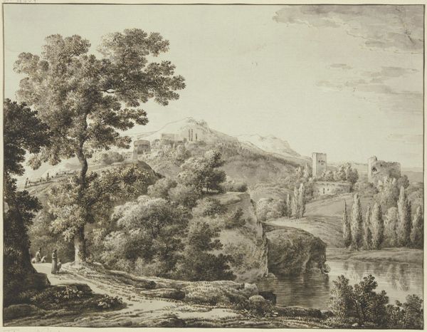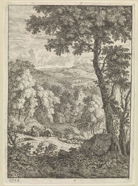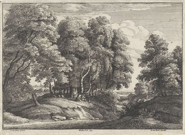 Editor: So this is Hendrik Voogd’s "Arcadian Landscape with Dancing Shepherdesses," an engraving dating somewhere between 1788 and 1839. It’s got this really serene, almost dreamlike quality to it. All those trees and the hazy mountains... what strikes you most about it? Curator: I'm drawn to the idea of "Arcadia" itself – a pastoral fantasy, often coded with hidden social commentary. What does it mean to evoke this idealized past in a period of immense social and political upheaval? Voogd’s technical skill gives us a soft, idealized view, but is it a total escape? Who is truly allowed into that idyllic clearing, dancing freely? Editor: That's a good point! I hadn’t thought about who gets to be carefree in this image. I guess the dancing shepherdesses are representative of a certain privilege. Is Voogd being critical or celebratory, do you think? Curator: It's not always easy to discern intention, but consider that idealized landscapes, particularly those harking back to classical antiquity, were frequently commissioned by and for elite patrons. Are these women dancing freely, or performing for the gaze of the viewer? Does Voogd present these figures uncritically, reinforcing traditional gender roles and class divisions? Editor: Hmm, that gives me a lot to consider. It is easy to get caught up in the beauty without thinking about those deeper issues of power. Curator: Exactly! And even the idea of "nature" itself, as presented here, is a construct deeply embedded in cultural values and hierarchies. The Romantics idealized nature as pure, separate from society, which ignores Indigenous connections to land. Questioning these narratives brings us to a fuller understanding. Editor: I think I’ll definitely look at landscape art differently from now on! Thanks! Curator: My pleasure! It’s vital we consider art's function as not just aesthetic experience but also as a carrier of complex social and political meanings.