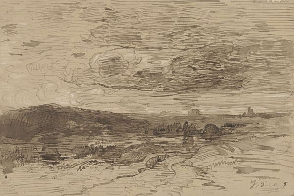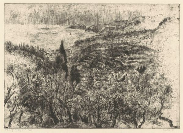 Editor: This is James N. Rosenberg's etching, "Field in Sunlight," created in 1919. It has a somewhat somber quality to it despite the title. I’m intrigued by the contrast between the subject matter, a sunlit field, and the heavy lines of the etching. What catches your eye in this piece? Curator: The striking element here is Rosenberg’s engagement with the physicality of the etching process. Observe how the labor-intensive act of carving into the plate and the printing process itself becomes a focal point. This method makes us consider not just the depiction of a landscape, but the artist's hand, the tools used, and ultimately the system of art production that makes such an image possible. How do you think the material affects our interpretation of the subject matter? Editor: It definitely shifts the perception. Instead of a tranquil, idyllic field, there's a sense of effort and perhaps even hardship. It makes me wonder about Rosenberg's own experiences at the time. Were etchings common at the time for landscape depictions? Curator: The accessibility of printmaking allowed for wider distribution, which made art more accessible and created a bigger market. Also, consider how the realism style fits within the cultural landscape of 1919, the period of post-war reconstruction and industrial growth. Do you see a reflection of this tension in this etching, given its seeming ambivalence towards ‘sunlight’? Editor: That's fascinating! I hadn't considered the societal context so explicitly. It changes my interpretation of the piece. Curator: By focusing on the process and materials, we unearth layers of meaning that might otherwise remain hidden. This is how art pushes beyond being simply representational and instead acts as a material record of production and cultural circumstances. Editor: I agree! Seeing how the etching process informs the emotional and social content really enriches my understanding. Thanks for showing me the importance of looking at the "how" and the "why" beyond the "what."