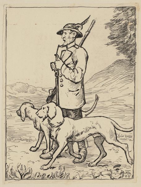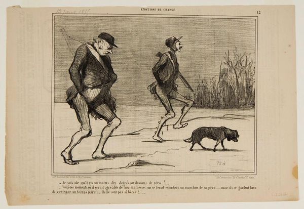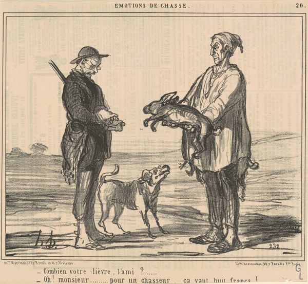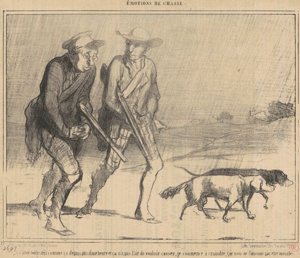 Curator: Honoré Daumier created this lithograph, "Voila pourtant ce qu'on est convenu d'appeler...", sometime in the 19th century. It translates to "Yet, this is what we have agreed to call...". Editor: The overwhelming emotion it conveys is...ennui. Note the contrasting postures. One figure slouches in quiet disappointment while his companion appears to be vocalizing the same sentiment. Curator: Indeed, it satirizes the bourgeoisie’s obsession with hunting as a leisure pursuit. The print comes from a series called "Les Plaisirs de la Chasse," published in the French satirical magazine, Le Charivari. Daumier was well known for using his art to critique social and political issues. Editor: His line work is incredibly efficient, especially the rendering of their clothing. And how economical the composition is; the expanse of flat space amplifies the men's disaffection. The dog mirrors this disillusionment. Look at that droop! Curator: The lithographic process allowed for the relatively inexpensive production of multiple copies. Daumier's caricatures were able to reach a wide audience. These works became instrumental in shaping public opinion and challenging the status quo during a time of significant social upheaval in France. Editor: The beauty is also in what isn't there—very few tonal shifts, and it's as though the light is bleaching all feeling from the scene. Curator: He had to negotiate the prevailing attitudes toward the aristocracy and the rapidly expanding middle class to make a living as an artist at this time, while also needing to express his own views. Daumier definitely found an astute way of commenting on the absurdity of social conventions through such work. Editor: It really underlines how formal constraints—the reduction to line and tone—can be just as powerful in conveying emotional depth as overt gestures. A truly brilliant observation on hunting as the leisure pursuit. Curator: The power of art lies in its ability to serve as a mirror, reflecting society's follies and prompting critical self-reflection, and Daumier excelled in just this regard. Editor: I think this confirms how strong visual economies, especially in the context of such clever caricature, result in affecting commentary.