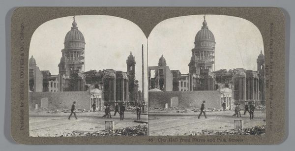Curator: Oh, I feel transported—there's something utterly romantic and wistful about this scene. It feels almost sepia-toned in memory even though it is literally that way. Editor: Indeed. Here we have Carlo Naya’s "View of Venice from the Ponte della Paglia," a gelatin silver print from around 1850-1880. The stereoscopic format invites a deeper look. Curator: Stereoscopic? Editor: Yes, two nearly identical images are presented side-by-side. When viewed with a stereoscope, the brain merges them, creating an illusion of depth. Curator: Ah, that’s why I felt pulled right in. The way the buildings on the Piazza San Marco sort of recede...it's cleverly done! Though the whole composition does have that classic Romantic Era focus on feeling over flawless accuracy. What draws you in? Editor: The photograph intrigues me as a formal exercise. Consider the architecture—the repeated columns create rhythm, a sort of visual meter. Also, notice how Naya frames the distant domes against the pale sky. It transforms Venice into an arrangement of shapes and lines, far from incidental, it gives an underlying structure to the entire panorama. Curator: True, but I’m still getting that immediate impression. A whisper of grand times now past, tourists milling in a place frozen by the photographer’s gaze. Like he's trying to keep it for himself... or maybe he already sees change coming and this is some sort of effort to seize its beauty for eternity? Editor: Perhaps the photograph serves as a cultural document as well as a piece of romantic scenery. Either way, there's definitely an intentional and constructed aesthetic at play that really draws us in today, hundreds of years later. Curator: Definitely food for thought, and a feast for the eyes.