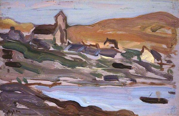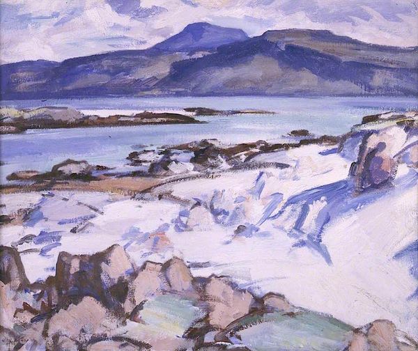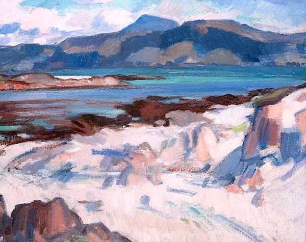 Curator: The prevailing mood to me is tranquility – soft blues and whites creating a sense of airy peace. What are your thoughts on "Iona, Pink Rocks," painted by Samuel Peploe in 1927? Editor: Well, the pink jumps out, doesn't it? That rosy hue against the cooler tones… there's a deliberate push and pull that prevents it from becoming saccharine. I sense an energy more than just peacefulness, a certain vital charge, particularly because Peploe painted it en plein air, a direct reaction to what he saw. Curator: Precisely! It represents much more than a simple landscape. Consider the pink: rocks imbued with this unexpected warmth. In cultural symbolism, pink, in its more diluted state as it contrasts the bolder red, signifies not only affection, but understanding and empathy. Could the presence of pink here point to a softer relationship of people to the Ionian landscape? Editor: That's interesting. Viewing it through the lens of social context, you see this was painted during a period of burgeoning tourism to the Scottish Isles. Perhaps the 'pinkness' serves as a gentle invitation to experience the landscape through a lens of idealized beauty, a kind of curated experience. After all, the Scottish Colourists aimed to bring modern art movements back home, filtered by the Scottish experience. Curator: An idealized beauty that may not accurately portray the reality of the landscape, right, or maybe an invitation of warmth and joy to encourage visitors from far and wide. In its construction we can read Peploe using colors to create meaning, the blocks creating abstract elements of depth and interest. A sort of emotive geography. Editor: That abstraction really does allow the viewer to project their own meanings. The scene is there, but almost simplified. It becomes about the feeling of Iona more than a photographic likeness, offering a space of personal contemplation. Perhaps encouraging those travelers of the era to do so within Scotland and their experiences within the Isle? Curator: Indeed. What appears initially simple, unfolds with rich symbolism. The personal and the geographical unite. Editor: Exactly. This seemingly tranquil landscape, then, turns out to be a rather charged, multi-layered representation of both place and culture.