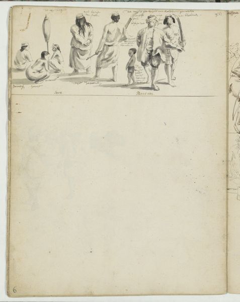 Editor: This is "Studieblad met verschillend geklede vrouwen die een last dragen," or "Sheet with differently dressed women carrying a burden," a drawing in ink, pencil, and possibly wash, dating from around 1660 by Wouter Schouten. I'm struck by how informal it feels, almost like a collection of snapshots capturing daily life. What do you see in this piece? Curator: Immediately, I see a rich tapestry of cultural memory encoded in these seemingly simple sketches. Look at the postures, the burdens these women carry. They evoke centuries of female labor, echoing in artistic depictions across cultures. Can you see how their bowed heads and stooped shoulders act as symbols, conveying not just physical weight, but perhaps also social or economic pressures? Editor: I see the physical strain, definitely. Is that why there are so many figures doing similar things? Is it to drive that idea home? Curator: Perhaps. Or consider the repetition as a kind of visual language, amplifying the theme of perseverance and resilience. Repetition itself can function as a symbolic act. These echoed figures call forth memories of women performing labor throughout time. Look at their clothing – how might those details provide insight into their status, roles within their community, and perhaps even trade routes? Editor: So you're saying that even simple lines sketching out clothes or posture could carry all this symbolic weight from the culture at the time? It makes you wonder what meaning future viewers might find. Curator: Precisely. Think of it as layers, an unfolding visual narrative with the weight of cultural understanding imbedded inside. And this act of looking across time, this continuity, is crucial to iconography. Editor: This really reframes how I think about even quick sketches like these; there is so much information hidden inside these images, beyond just the surface-level view.