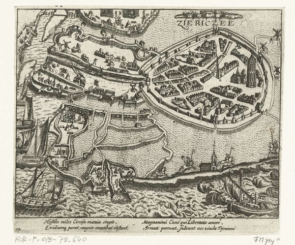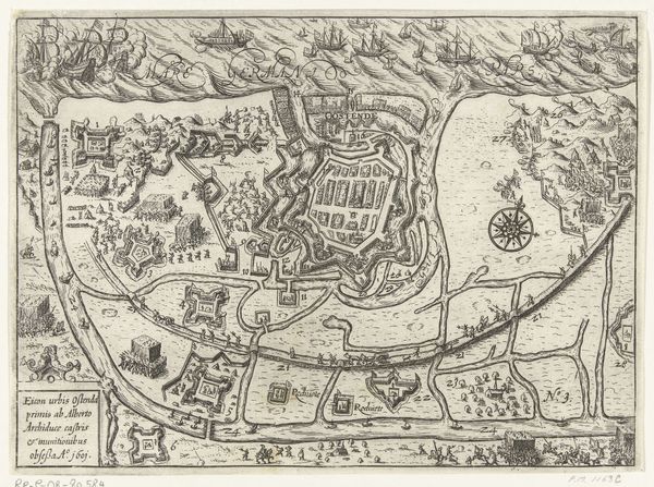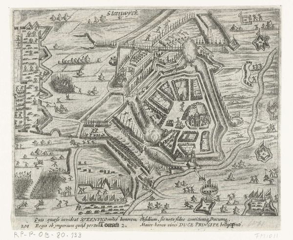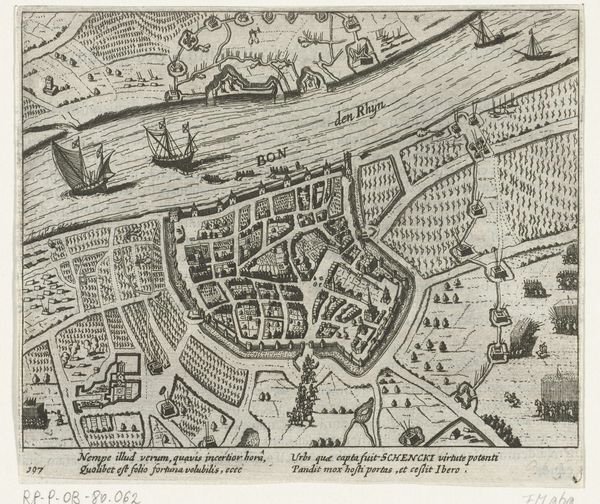 This anonymous print, realized in 1597, depicts the siege and capture of Rheinberg. Notice how the composition is structured around a bird's-eye view, offering a comprehensive layout of the town and its surrounding landscape. The artist employs a meticulous, almost diagrammatic, style. Lines are precise, delineating the fortifications, rivers, and troop formations. This attention to detail creates a sense of order and control, yet the chaotic scene of warfare introduces a tension between order and disorder. The light and shadow are delicately rendered to give depth to the flat plane. The rigid geometric forms of the fortresses contrast with the organic shapes of the landscape, creating a visual interplay that reflects the conflict between human-made structures and the natural world. The print invites us to consider how such representations of conflict not only document events but also participate in shaping perceptions of power and territory.