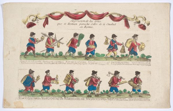 Editor: This is an engraving from 1872 to 1875, of a print titled "Dubbele plaat met twaalf gewapende burgers in uniform volgens de mode in Antwerpen, ca. 1580." The artist is anonymous and the piece is a colourful group portrait depicting armed citizens. What's fascinating is the way each figure seems so self-contained, despite being part of a larger group. What kind of story do you think these figures tell? Curator: This print encapsulates a powerful narrative about civic identity. Note the uniformity, yet also the subtle differentiations in dress. This reflects the tension between communal responsibility and individual expression. These details offer visual cues – emblems of their social standing. Consider their weaponry: are they for display, defense, or perhaps symbols of power within the community? Editor: I see that! It's like they are making a statement about the status of their role. And is the bright colour indicative of something or to make them seem modern in this art piece? Curator: The use of vibrant colour serves a dual purpose. On one hand, it recalls the elaborate displays of wealth and status that characterized Renaissance society. On the other, it imbues the scene with a sense of timelessness – a reminder that certain aspects of human nature, like the desire for recognition and belonging, transcend historical eras. Editor: So the print captures this balance between individual identity and belonging through not only colour, but costume, weaponry, and status? Curator: Precisely! This work functions almost as a psychological profile of Antwerp society in the late 16th century, doesn't it? How public image, group dynamic, and societal stability were interlinked and performed daily. It uses this visual memory as an expression. Editor: I had not considered the performance part of the memory aspect. That opens so much interpretation, thinking about cultural expectations and performance of character! Curator: It also reminds us that even in supposed group settings, there can still be very personal projections, doesn’t it?